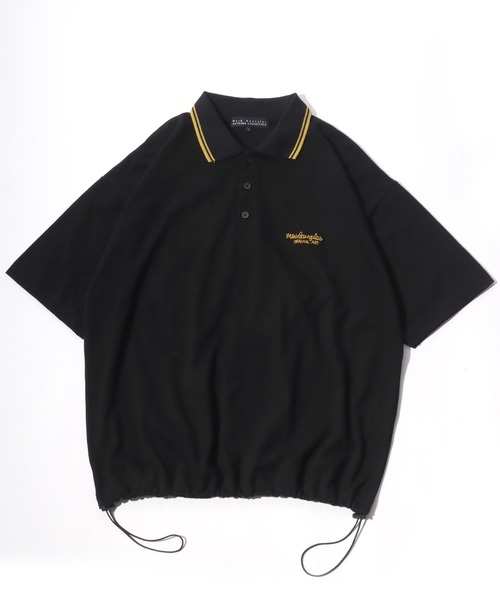 トレンドのドローコード付きで絞り調整のできるストリート、スケーター、アメカジテイストの襟ラインワンポイント刺繍ポロシャツ。