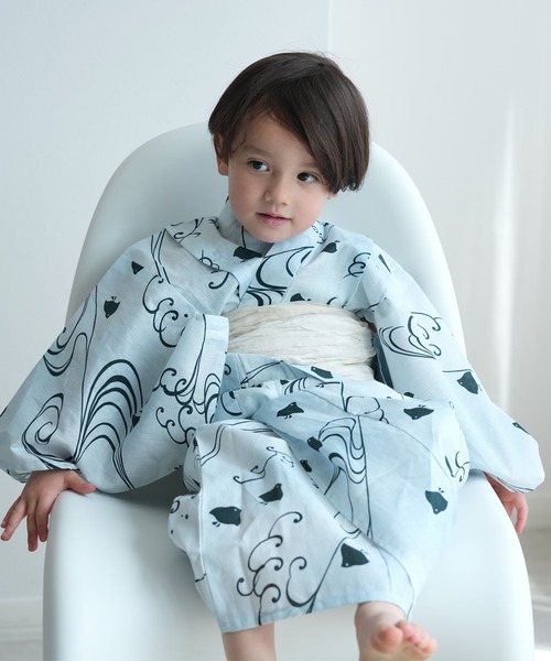 【utatane kids 高級変わり織 子供浴衣3点セット 男の子 淡い水色ぼかしに碧色の千鳥】