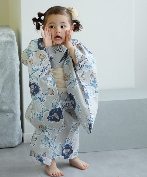 【utatane kids 高級変わり織 子供浴衣3点セット 女の子 薄グレーに椿唐草】