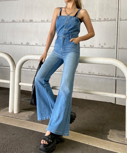 バックシャンなリボンデザインが夏服から秋服コーデに可愛いデニムフレアオールインワン。裾にかけて広がるフレアシルエットが