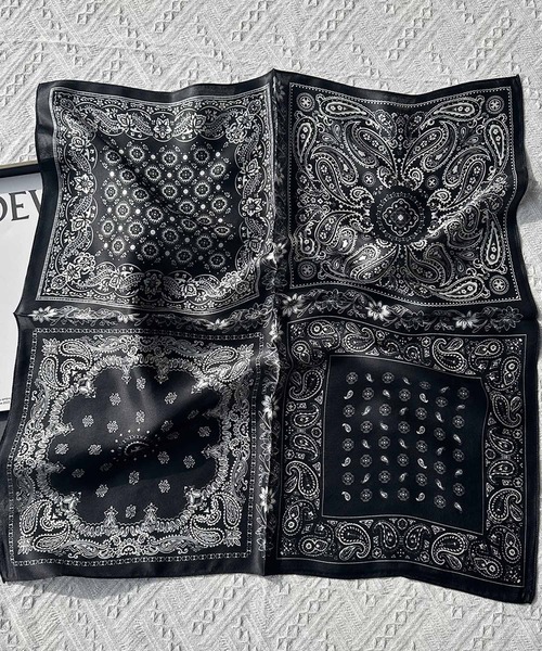 ・頭や首元、キャップの上から被ったり、ヘアアレンジに使用してターバンやシュシュのように使ったり、バッグなどにアクセサリー感覚で取り入れるのも◎