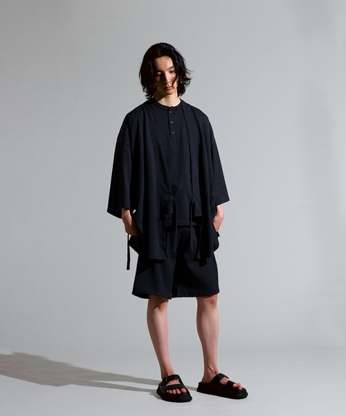 涼やかな風合いとこなれ感が魅力の、楊柳(ようりゅう)素材の甚平セットアップ。さらりと羽織れるドロップショルダーとワイドシルエットが、ルームウェア感を超えた都会的な抜け感を演出します。着物ライクなカシュクールデザインに、シンプルなタイ使いと大きめポケットで実用性も◎ショーツも同素材で仕上げ、統一感のあるセットアップスタイルに。Tシャツやタンクトップをインナーに重ねてラフに着こなせば、シティボーイや韓国ストリート、和モードな雰囲気も楽しめます。