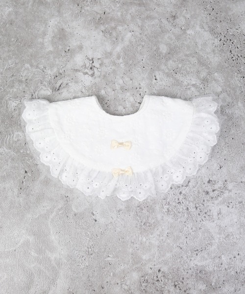 繊細なレースとフリルがあしらわれた、まるでドレスのようなベビースタイ。どちらも同系色の小さなリボンが2つ付いており、上品な印象に仕上がっています。スタイ全体には刺繍のような花柄が施されており、裾はチュールのフリルでふんわりと仕上げられています。肌ざわりの良いコットン素材を使用しており、赤ちゃんのお肌にも優しく、デリケートな首元をやさしく包みます。