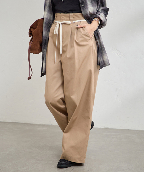 ポリエステル混できれいな見た目のしわになりにくいチノ素材を使用し、タックを入れ、裾幅を広めにしたワイドシルエット。