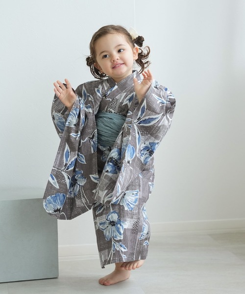 【ニコアンティーク kids 高級変わり織 子供浴衣3点セット 女の子 かすれアネモネ グレー×ブルー】