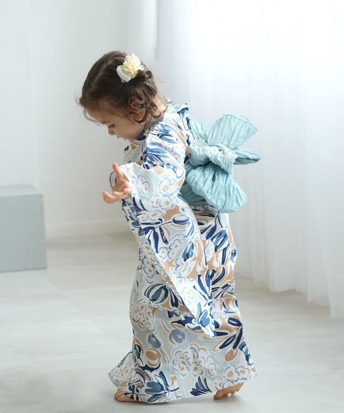 【ニコアンティーク kids 高級変わり織 子供浴衣3点セット 女の子 フロスティブルーの花】