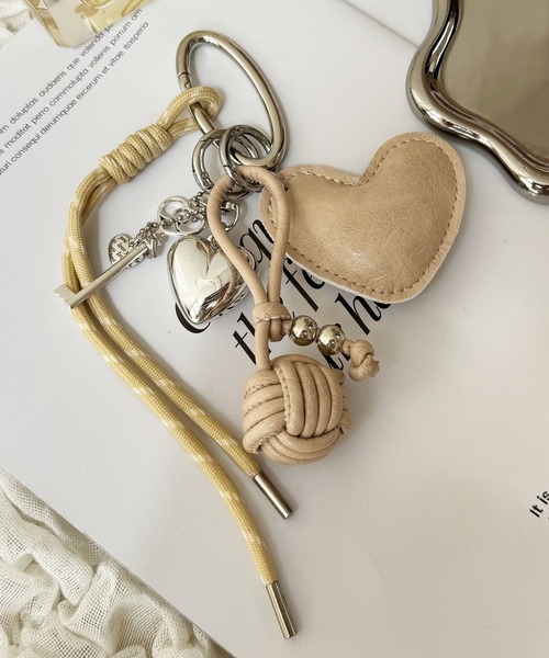 レザータイプのハートチャームとロープストラップをカラビナでまとめたキーリングにもなるバッグチャーム。