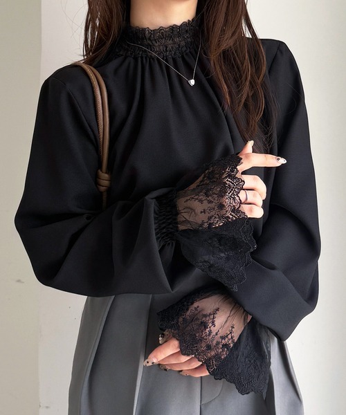 ハイネックと袖先の繊細なレースが華やかなプルオーバーブラウス