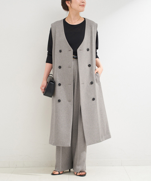 スリーブレスで秋口の羽織としても重宝するロングジレはジャンスカ風にも着用可能な丈感、ダブル前のボタンがクラシックな印象。パンツは着回ししやすいややテーバードにフロントタックをいれ、センタープレスに繋げてきちんと感を出しました。