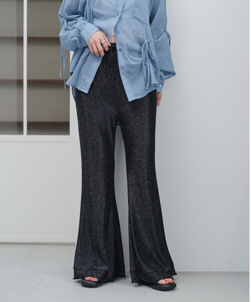 華やかな光沢と美脚に見せてくれる落ち感のあるラメパンツ。