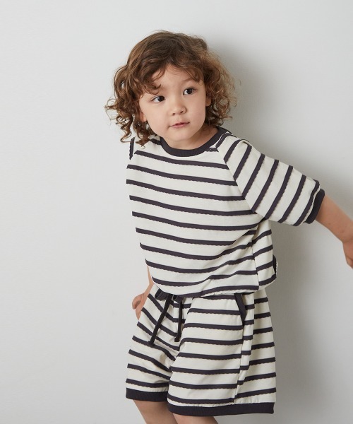 ふんわり立体的なスカラップボーダーが可愛い、カットソー素材のセットアップ。トップスは動きやすいラグランスリーブで、ボトムスはウエストゴムの程よくゆとりのあるショートパンツ。