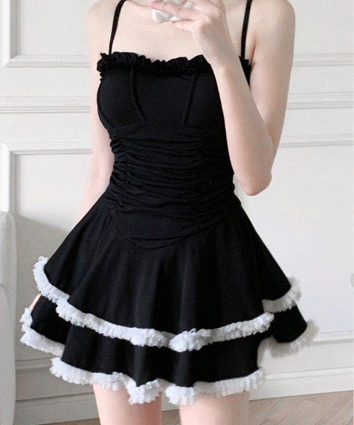 レディース スイムウェア ワンピース水着 オールインワン フリル フレアスカート 体型カバー パンツ付き ノンワイヤー 体型カバー シャーリング 海外ファッション 韓国 フェミニン リボン フレンチガーリッシュ