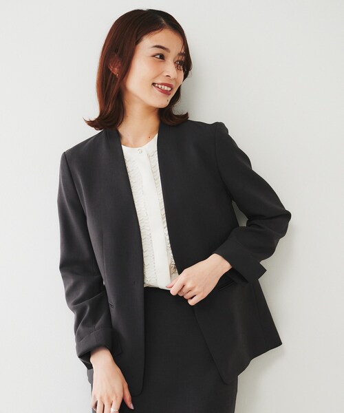 ウエストが程よくシェイプした女性らしいシルエットのカラーレスジャケット。