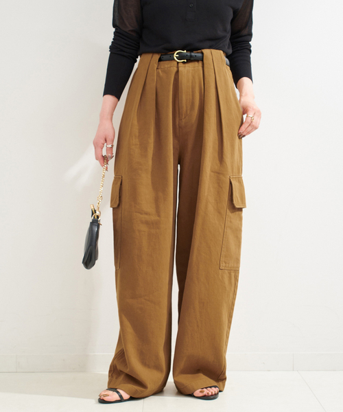 ミリタリーテイストを取り入れつつ、バックサテン生地に特殊加工で微起毛感を出して、しっとりソフトタッチな風合いに仕上げています。変形2タックで太めのバギーシルエットが新鮮、前ウエストはタック内側にベルトが通せる変わったデザイン。