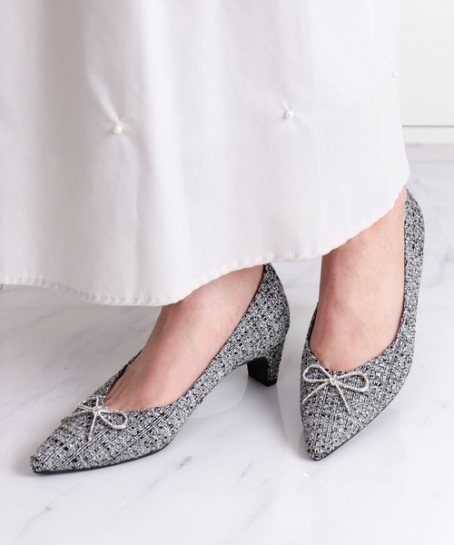 《デザイン》・ラインストーンの細リボンが可愛いパンプス。・ポインテッドトゥなので大人っぽく履けます。