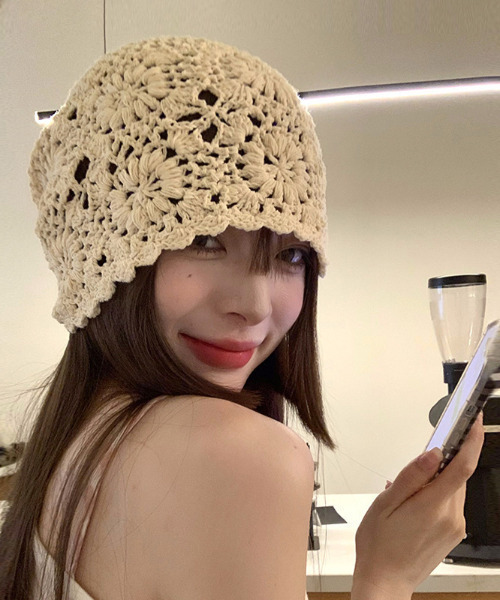 クロシェ(釣り鐘)編みのデザインなので、なだらかに丸く、フェイスラインをすっきり小顔に見せてくれます♪