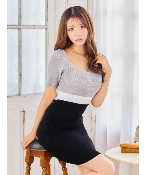 バイカラー配色にウエストラインの切り替えがアクセントになったニットワンピース。