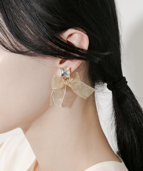耳元で上品に輝くストーンと、軽やかなシアー素材のリボンが組み合わさったイヤリング。