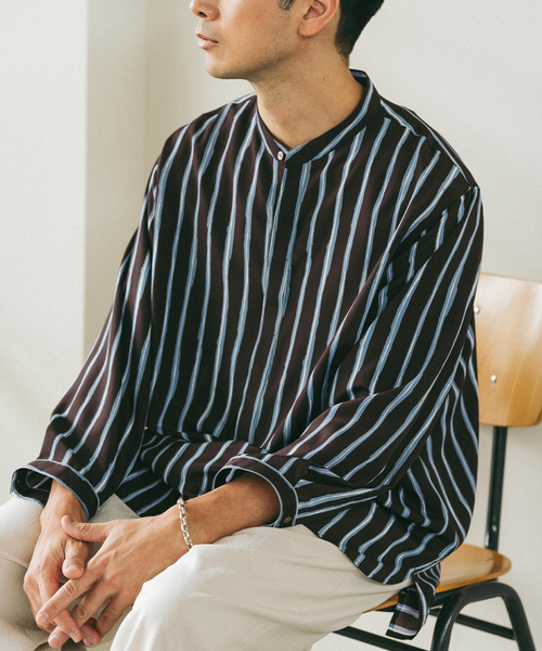・比翼仕立ての前立てが特徴的な、プルオーバータイプのバンドカラーシャツ