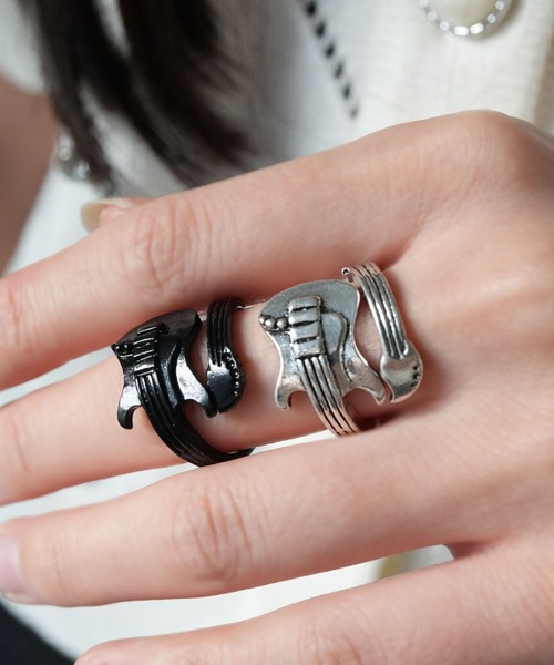 ギターモチーフのリングが、手元にエッジの効いた個性をプラスしてくれる。