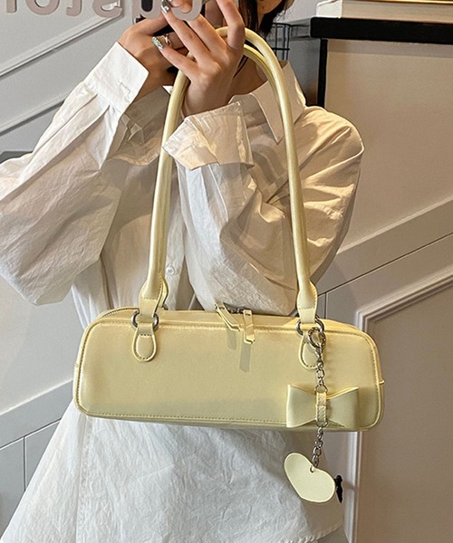 キュートで上品な雰囲気を兼ね備えた、リボンチャームがポイントのスクエア型ショルダーバッグ。コロンとした細長フォルムに、光沢感のあるフェイクレザー素材が洗練された印象を演出。ハート型チャーム付きのチェーンで、動きが出て女性らしさもプラスされます。持ちやすいダブルハンドルデザインで、肩掛けも手持ちも可能。コンパクトながらマチがしっかりあり、見た目以上の収納力も◎。スマホ・コスメ・ミニ財布など、日常使いにちょうど良いサイズ感です。スタイリング提案・ガーリーテイストなスカートやワンピースと好相性・スウェットやデニムに合わせた甘辛MIXもおすすめ・推し活バッグやプレゼントにもぴったりのデザイン