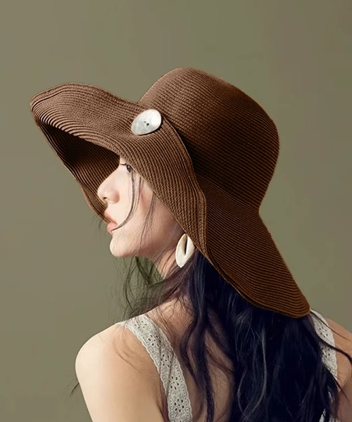 緩やかな曲線を描く広めのブリムが顔まわりをしっかりカバーしてくれる、エレガントなムード漂うサマーハット。帽子サイドにはメタルボタンをあしらい、クールなアクセントをプラス。軽量かつ柔らかな素材で被り心地も快適。コンパクトに折りたたむこともでき、持ち運びにも便利です。日差しの強い季節にぴったりな、機能性とデザイン性を兼ね備えたアイテムです。ワンピースやシャツワンピ、リゾートスタイルにはもちろん、Tシャツやデニムなどカジュアルな装いにもマッチ。海辺の旅行や日常のお出かけ、散歩時の紫外線対策にも活躍します。