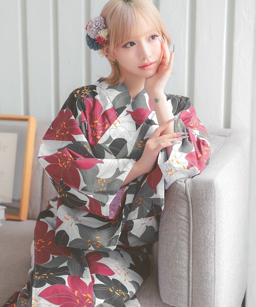商品名:浴衣セット レディース 4色百合柄 レトロシリーズ ゆかた3点セット 浴衣 平帯 下駄かわいい