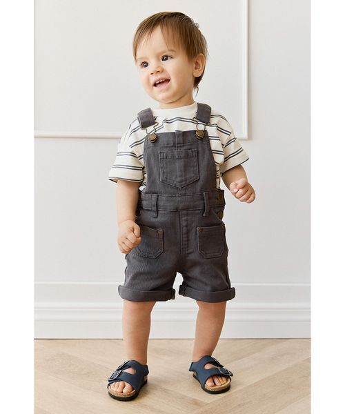 コットンツィル素材を使用したハーフ丈のオーバーオール。さまざまなカラーのインナーと合わせやすく、カジュアルな印象になりすぎないチャコールグレーのカラー展開です。男の子も女の子も性別問わずご着用いただけます。