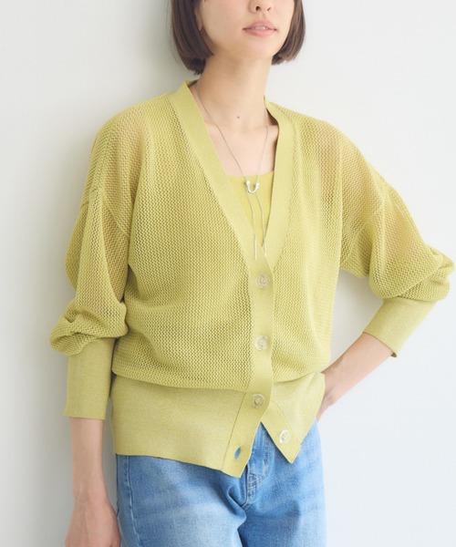 ・涼やかなメッシュ編みで仕上げたカーディガンは、光を受けるたびにさりげなくきらめき、顔周りを明るく華やかに演出。