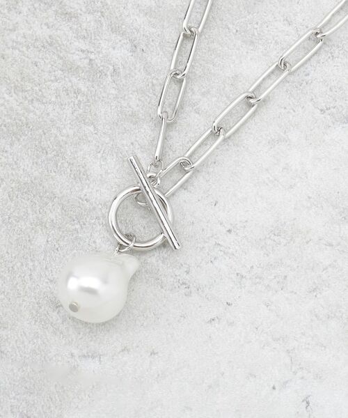 大きめのフェイクパールとチェーンを掛け合わせたマンテルネックレス