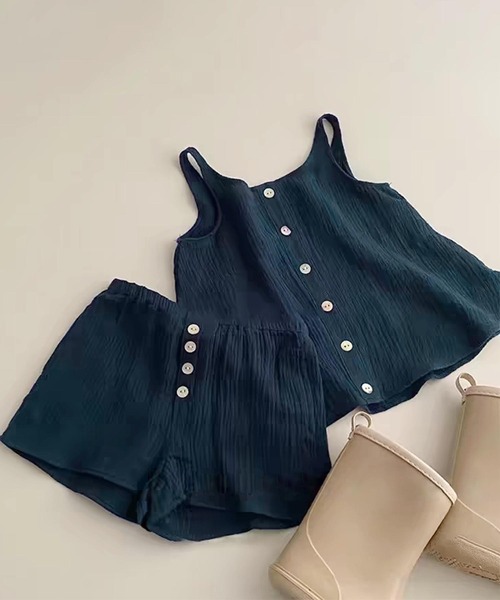 トップスとショートパンツは同素材・同色で統一感があり、フロントのボタンがナチュラルなアクセントに。お着替えもしやすく、デイリー使いにぴったりです。