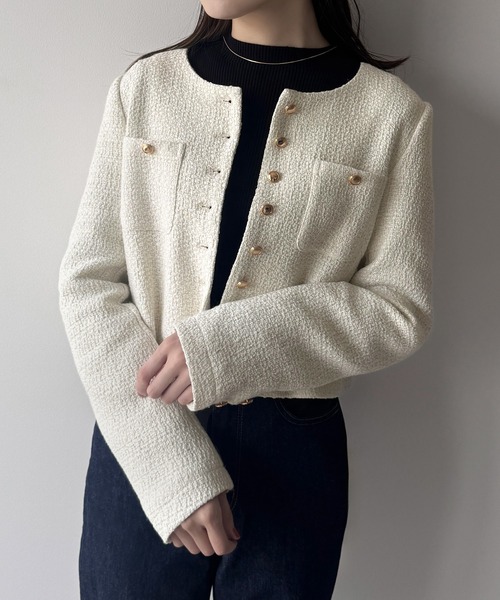 大人上品に着こなす金釦ツイードジャケット。