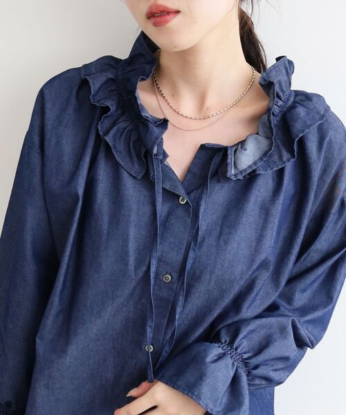 薄手のシャツデニムを使用した、フェミニンな雰囲気のブラウス。