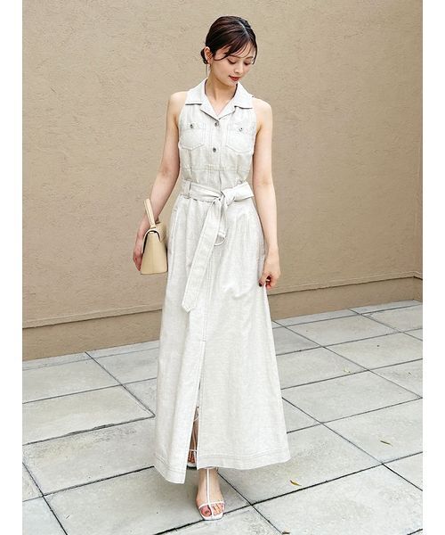 綿リネン素材にワンウォッシュ加工を加えて表情を出した、春夏にぴったりのレディライクなIラインロングサファリディテールワンピースです。上見頃は襟付きシャツデザインで、程よくきちんと感をプラス。スカート部分はフロントにスリットを入れて足捌きを軽やかに仕上げました。ウエストには取り外しのできるDカン付きの共布リボンが施されており、ウエストマークすることでメリハリのあるシルエットに。胸元とサイドにポケット付きです。