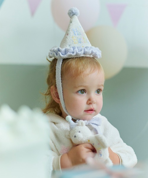 HAPPY BIRTHDAYのロゴと、カラフルな星の刺繍が楽しげなアニバーサリーハットです。ふんわり軽い‘エアリーモコ’を使用し、ホイップクリームのようなフリルが赤ちゃんのお顔を華やかに彩るデザイン。バースデーフォトなどの記念日のシーンにおすすめのアイテムです。スター柄ニットウェアと合わせたり、同シリーズのベアラトルと組み合わせてギフトにもおすすめです。
