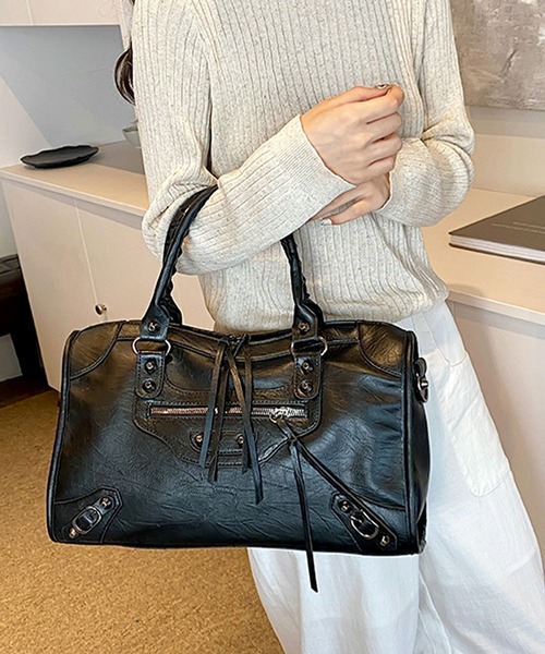 大人気、ブラックスタッズスクエアボストンバッグ/ハンドバッグ/ショルダーバッグ。