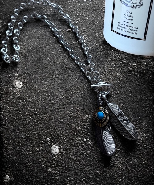 ターコイズ柄ストーンとフェザーパーツが織りなす、ネイティブアメリカンテイストの一品。自然体で無骨な魅力を引き立てます。