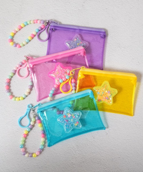 パステルカラーのビーズストラップ付きで、持ち歩きも楽しく♪全4色(パープル・ピンク・イエロー・ブルー)から選べて、推し活グッズや小物収納にもぴったり。中身が見えるから使いやすく、コスメ、アクセ、文房具などを入れてもOK!子供から大人まで♡自分用にはもちろん、友達へのプチギフトにもおすすめです♪