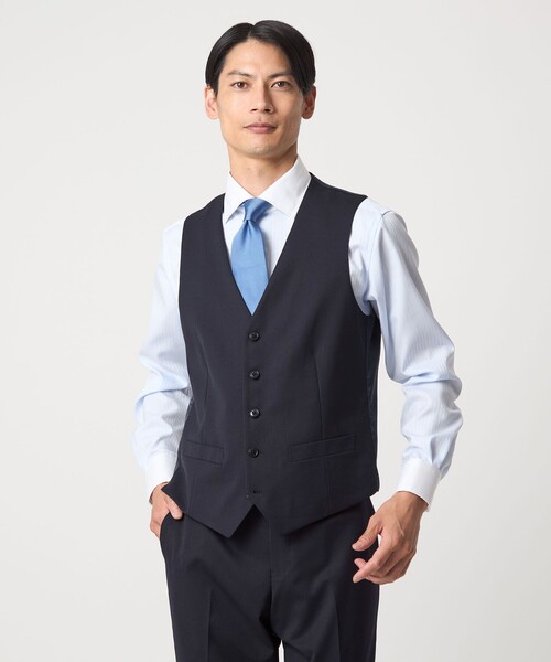 同素材ジャケットとパンツとの3ピーススーツスタイルがおすすめ。
