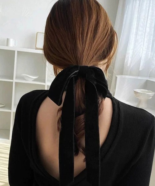 ・上品な光沢が魅力のベロア素材で仕立てた、リボン付きシュシュ。