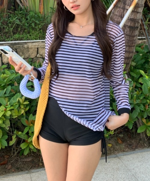洋服を着ている感覚で、露出を控えたうれしい水着のセットです。