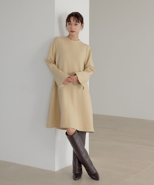 スカートの揺れ感がきれいに出るオフボディのシルエットに、さりげなくステッチを効かせたディティールやロングカフスがポイント。