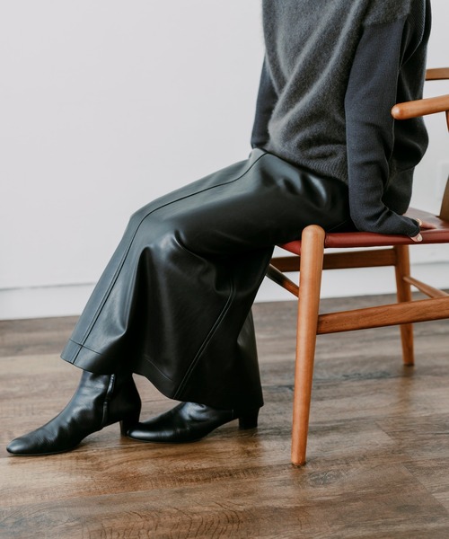 ライトウェイトに仕上げたフェイクレザーのスカート。センターに縫い目とステッチを施し、縦見えによる美しいシルエットにこだわりました。