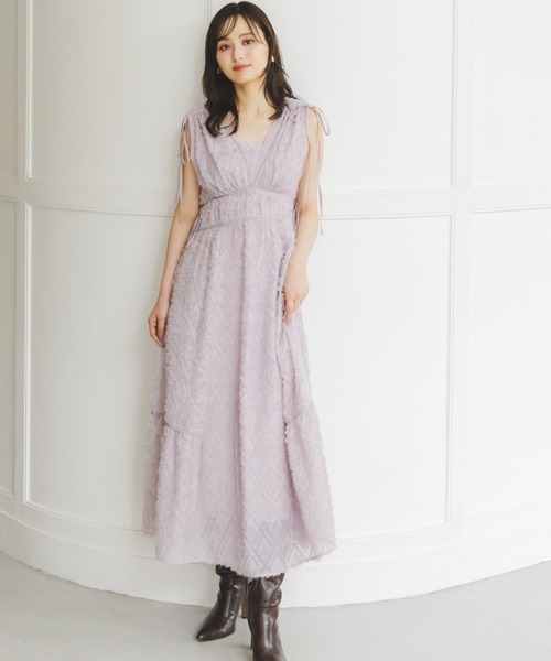 ふんわりフェミニンに、毛足を出したダイア柄のジャガード生地がスペシャル感のある上品なジャガードドロストディテールノースリワンピがお目見え。柔らかな生地を使用し、裾にティアードデザインを加えてふんわりとさせた、布が流れるラインの美しいワンピースです。ショルダーは今季らしいドロスト仕様で華やかに。肩から垂れる華奢な長めのリボンが顔まわりを明るく演出します。前後V開きで抜け感のあるデザインが魅力です。ドロストプリントワンピ(SWFO254120)とベースの型は同じですが、違う点はサイドのリボンの仕様。このワンピは、ウエスト前後に紐を通し、脇で絞ってリボン結びにしてシルエットを調節いただけます。背中側のファスナーで着脱いただけます。