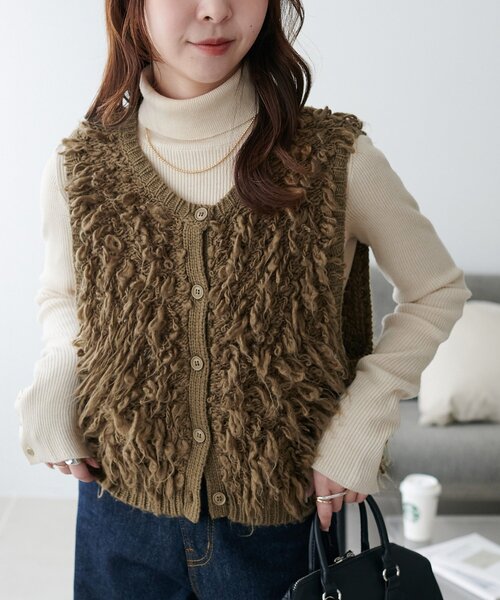 コーデを格上げ、旬のレイヤードスタイルが叶う2WAYニットベスト●デザイン表情豊かなループヤーンを全体に施した、ふんわり立体感のあるニットベスト。