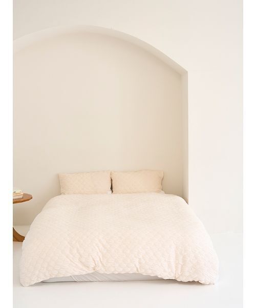 くしゅっとギャザーが入った、ふくれジャガードの寝具シリーズ。ぽこぽことした表面感がキュートな、シングルサイズの寝具3点セットです。ピローケースと掛けカバーはふくれジャガード、ボックスシーツのみフラットな生地を使用しました。いずれも柔らかなカットソー素材なので、肌触りが優しく季節を問わずご使用いただけるのも魅力。シンプルなデザインで、幅広いインテリアになじみます。色はオフホワイトとブルーの2色展開。ギフトにもおすすめのアイテムです。