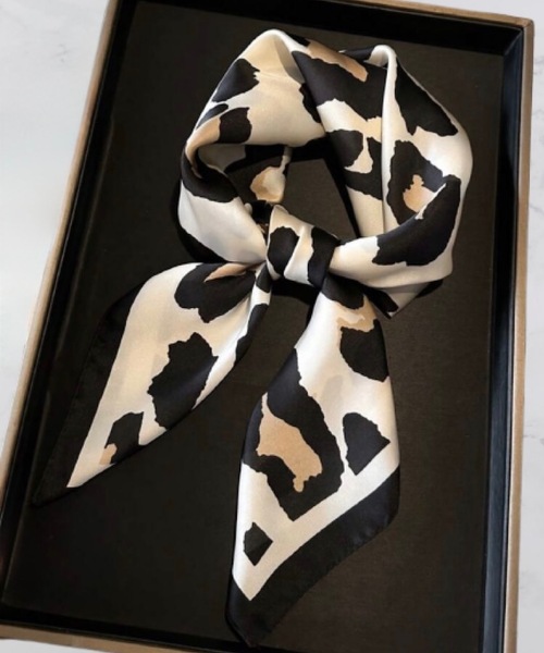 高級感のあるシルキータッチのポリエステル素材を使用したヒョウ柄スカーフ。
