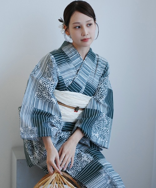 浴衣 浴衣2点セット 抹茶の縞々と菊の変わり市松 レディース
