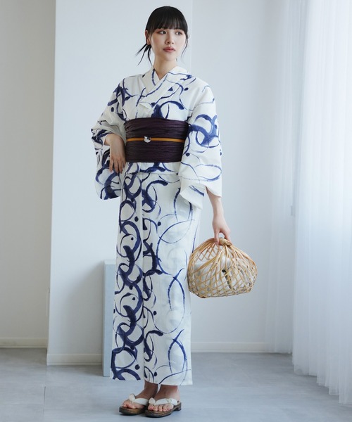 浴衣 浴衣2点セット 白地に紺のぼかし筆描き レディース