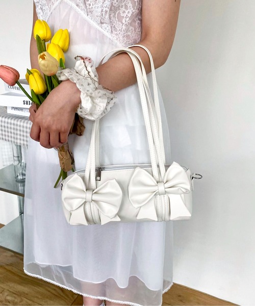 大きめのリボンが2つ並んだ、キュートさ満点のミニボストンバッグ。